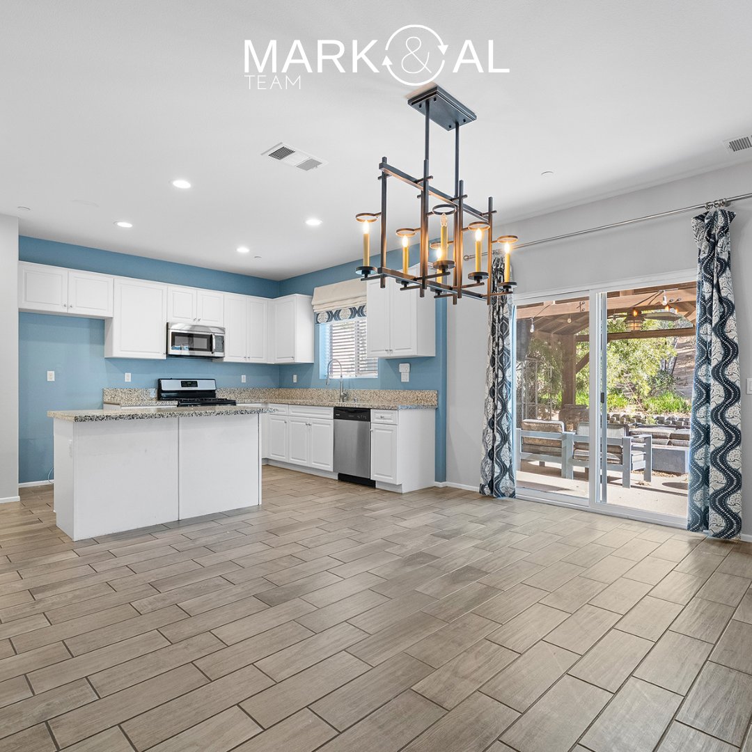 At the heart of the home is a chef-inspired kitchen featuring a large center island, granite countertops, and stainless steel appliances. The kitchen opens seamlessly to expansive living and dining areas, creating an ideal setting for both everyday living and entertaining.